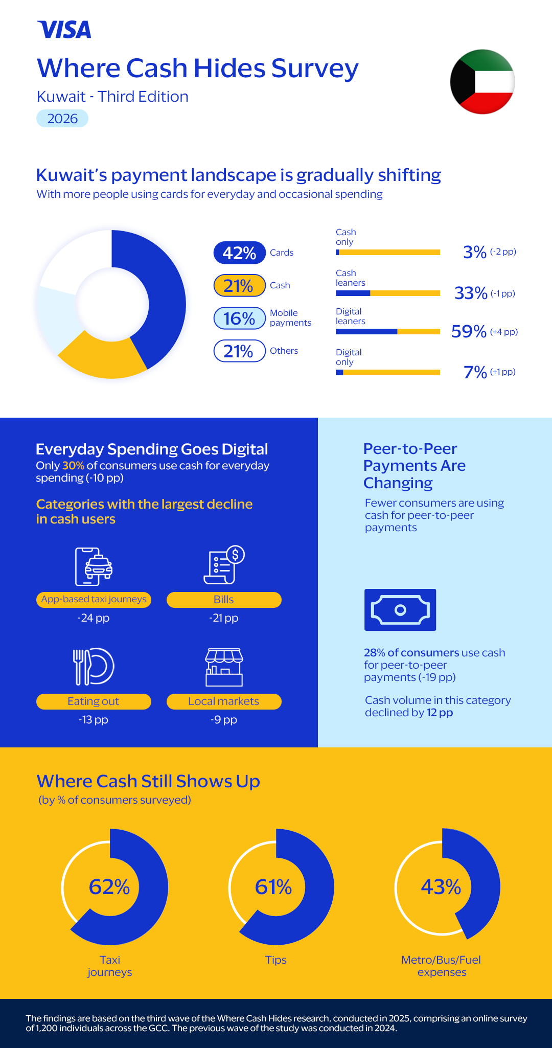 Kuwait City, Kuwait — January 21, 2026: Across Kuwait, payment habits continue to rapidly evolve, with more consumers embracing faster, more secure digital experiences. Visa’s third edition ‘Where Cash Hides’ report¹ shows 59% of Kuwait consumers are largely non-cash users, making most of their payments with payments cards or mobile devices. This is an increase of 4% compared with last year, highlighting a clear move away from cash.